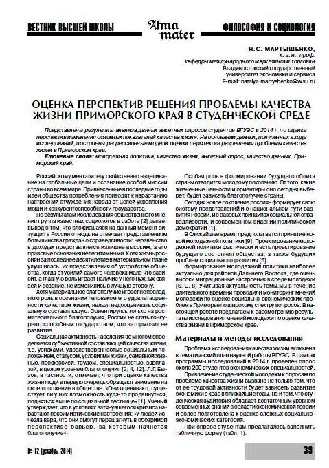 Оценка перспектив решения проблемы качества жизни Приморского края в студенческой среде